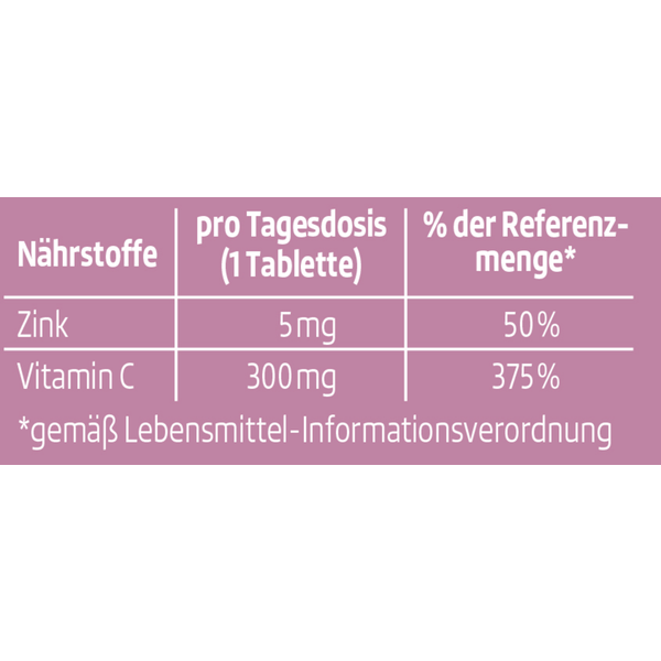 Zink ist ein Spurenelement, das im Stoffwechsel wichtige Funktionen erfüllt und Bestandteil von zahlreichen Enzymen ist. Zink trägt zu einer normalen Zellteilung und zusammen mit Vitamin C zum Schutz der Zellbestandteile vor oxidativem Stress bei.